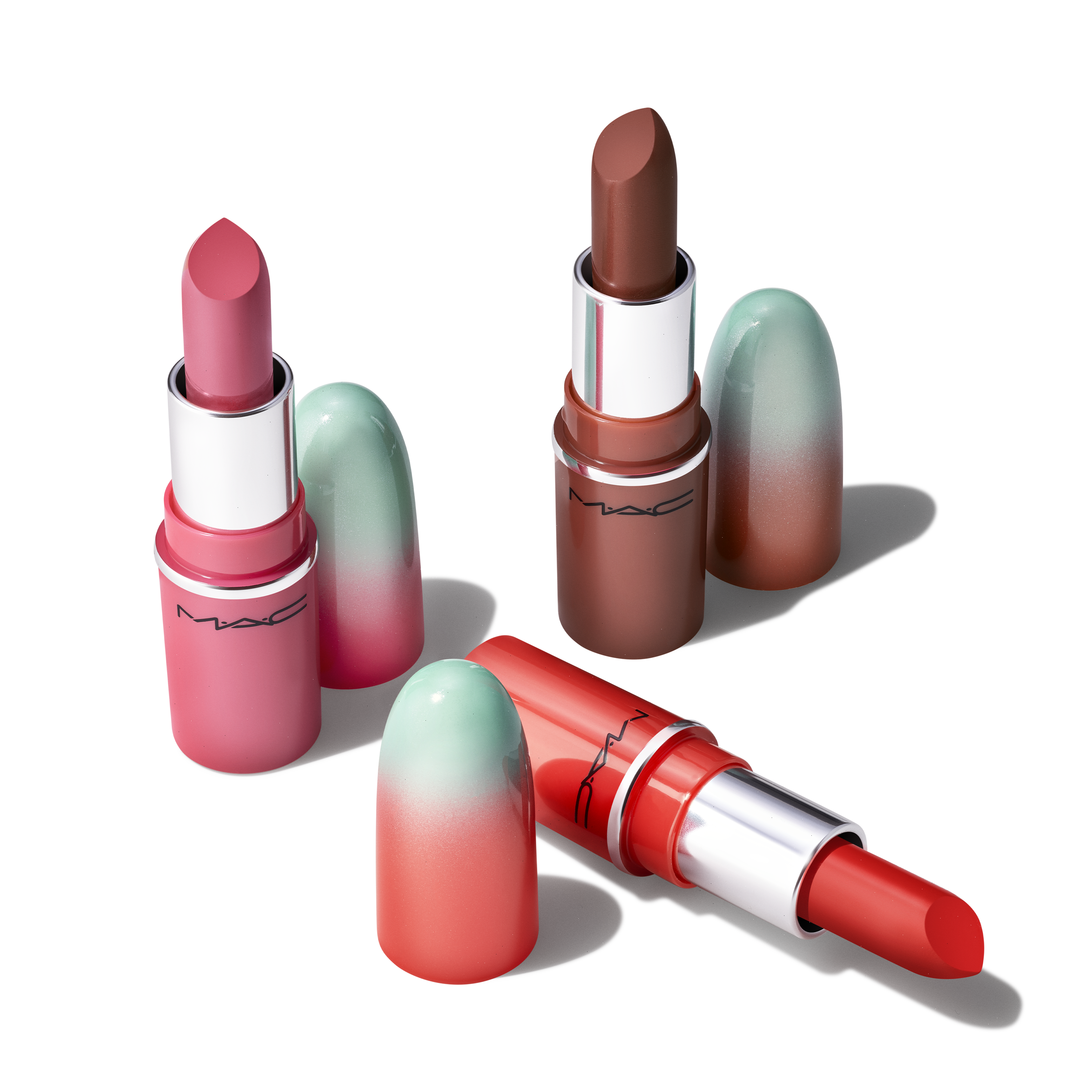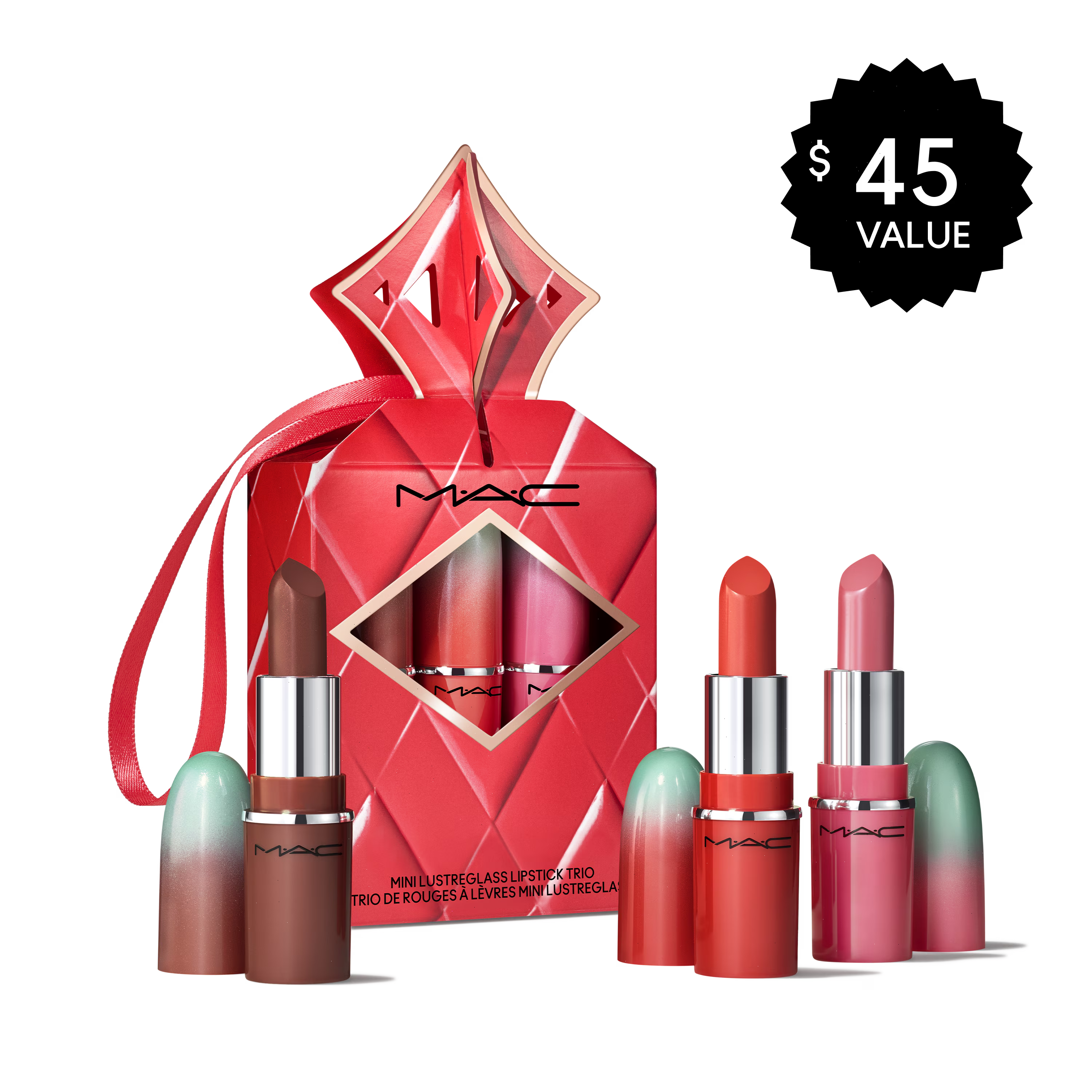 A giftable, holiday-exclusive lip trio of mini Lustreglass Sheer-Shine Lipstick in best-selling Nude and Bright shades at a M·A·Cnificent value
