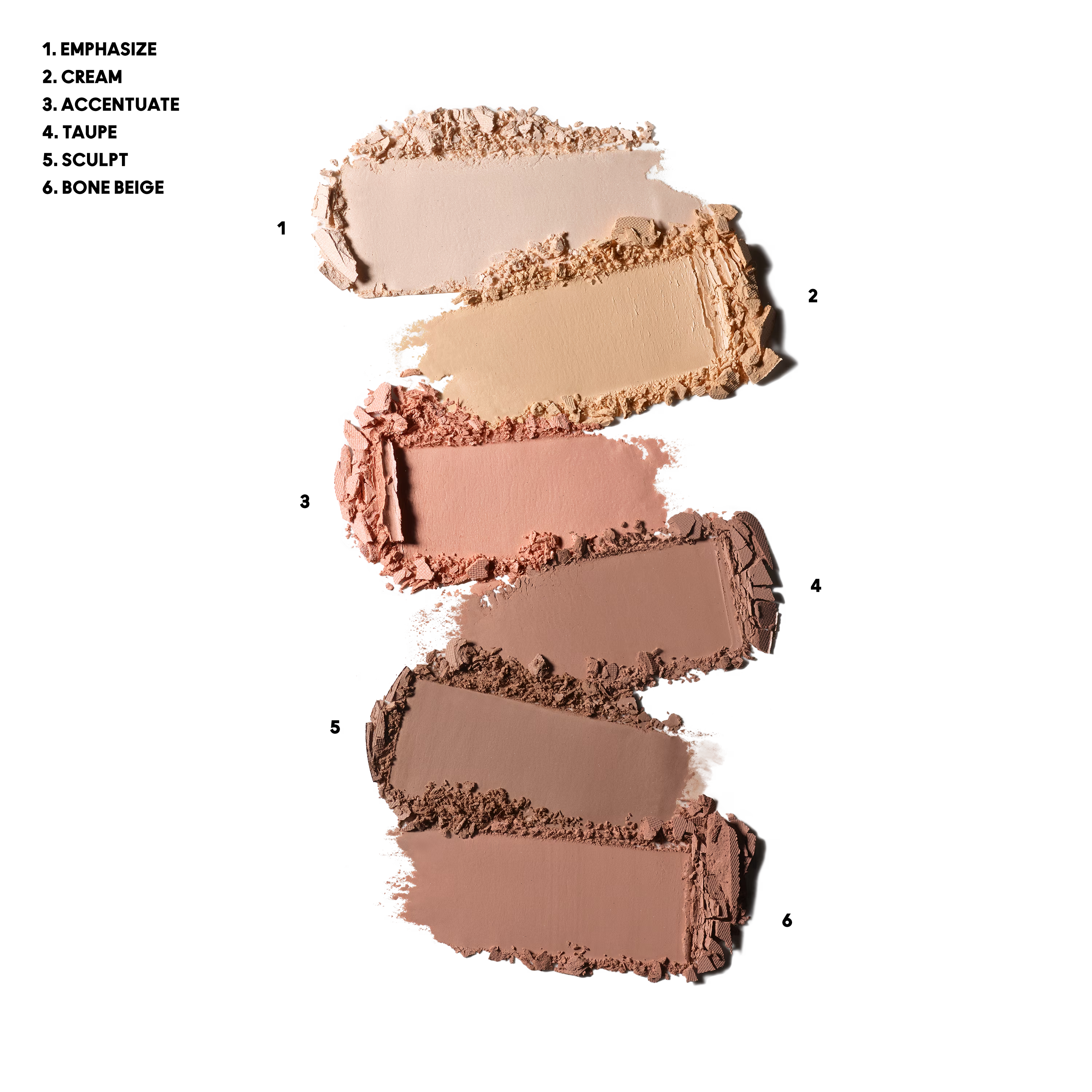 An expertly edited palette that contains three matte contouring powders and three subtly shimmery highlighting powders for light-to-medium skin tones.
